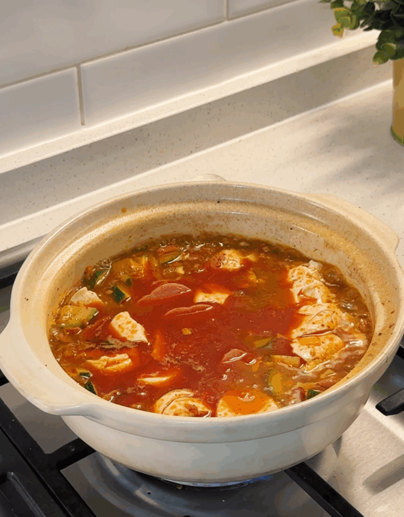 This version takes inspiration from two beloved Korean stews: sundubu jjigae and budae jjigae (Korean army stew). It blends the soft tofu and chili oil base of sundubu with the hearty, nostalgic elements of budae (namely luncheon meat and melting cheese). You get the silky texture of tofu, the umami depth of anchovy broth, and a punch of savory flavor from the canned meat and cheese. It’s rich, cozy, and a little indulgent, in the best way. Perfect with a hot bowl of rice.
